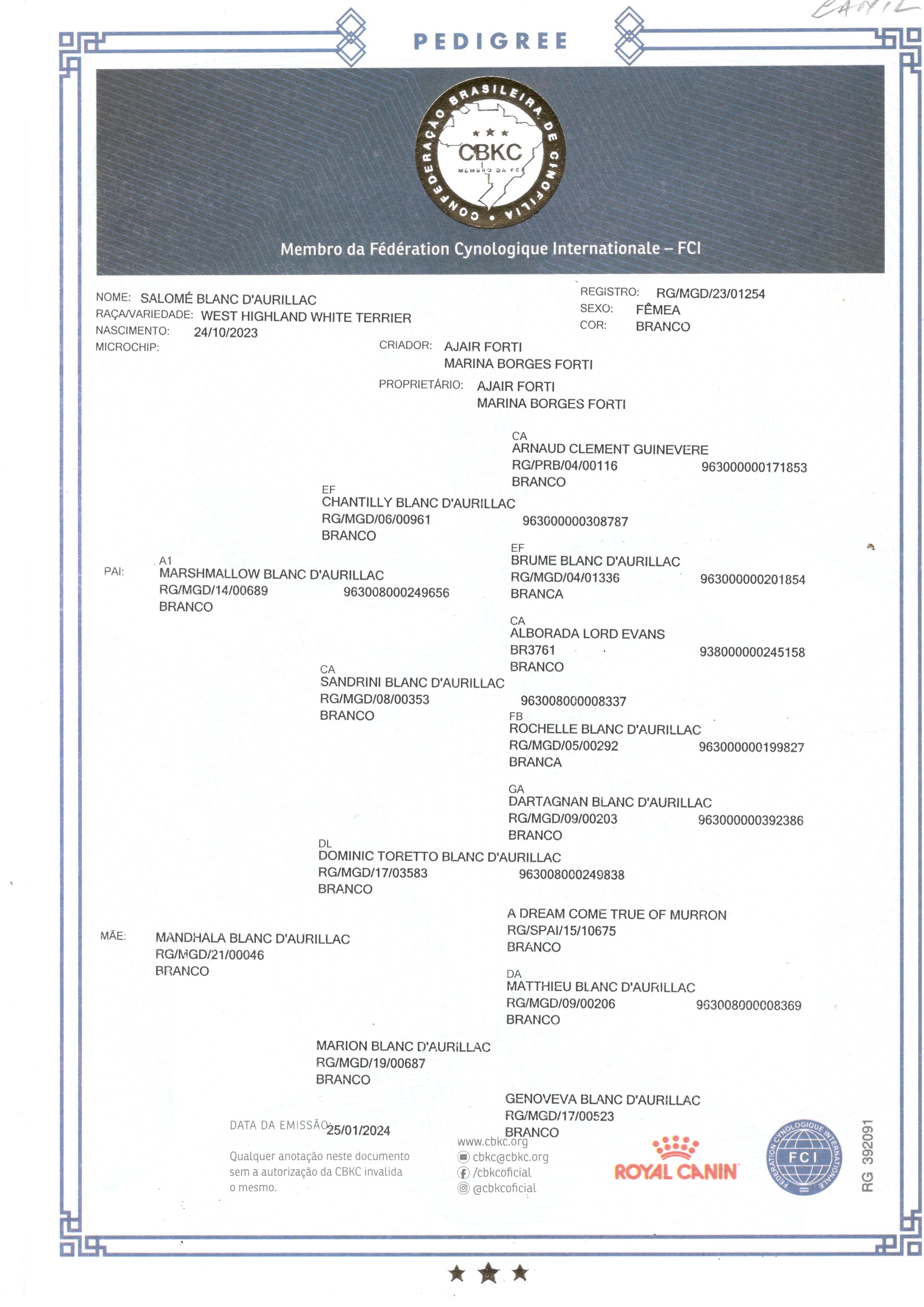 Origem: CANIL BLANC D'AURILLAC